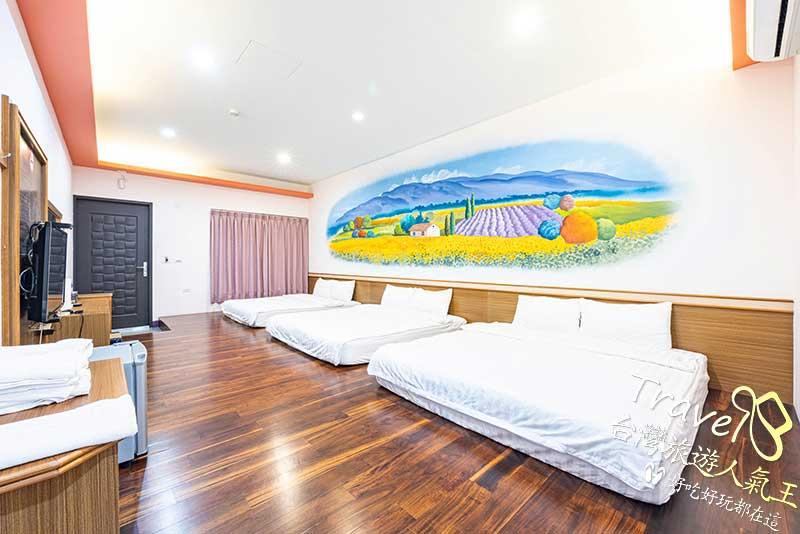 (三張大床+木地板+橘色燈槽) 鄉村主題六人房,童趣牆面搭配寬敞格局,家庭入住超合適!