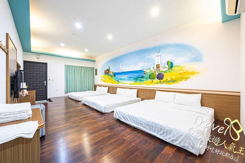 (牆上海景彩繪+綠窗簾) 海岸彩繪主題房,擁有明亮採光與舒適三大床,活潑又自在。