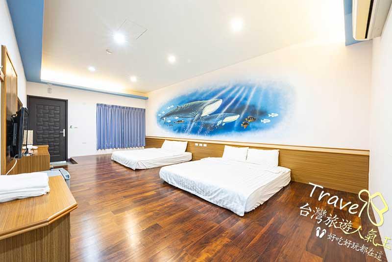 (鯨魚壁畫+藍窗簾) 寬敞四人房,溫暖木地板與舒適照明,是親子旅遊首選空間。