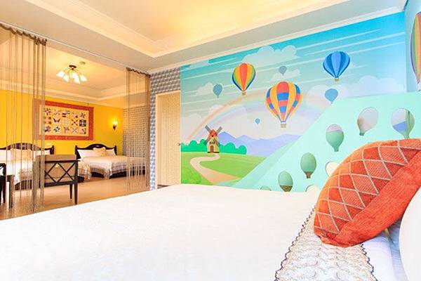 熱氣球溜滑梯六人房:這間是提供六人的房間,可以提供家庭團體親子住宿同一間房間,房間裡面還有佈置童話般的溜滑梯,房間外更有可以看到戶外庭院的陽台,根本就像一個兒童城堡。
