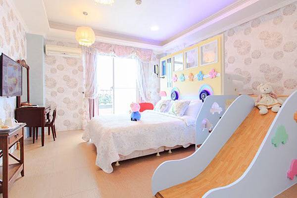 城堡溜滑梯四人房:從戶外走到室內,已經嘆為觀止了,一路上拿著相機的手不停的按下快門,走到這間四人房後,更是驚訝,完全是卡通公主風的設計,不只是兒童會驚聲連連,就會連同行的大人都難以控制。